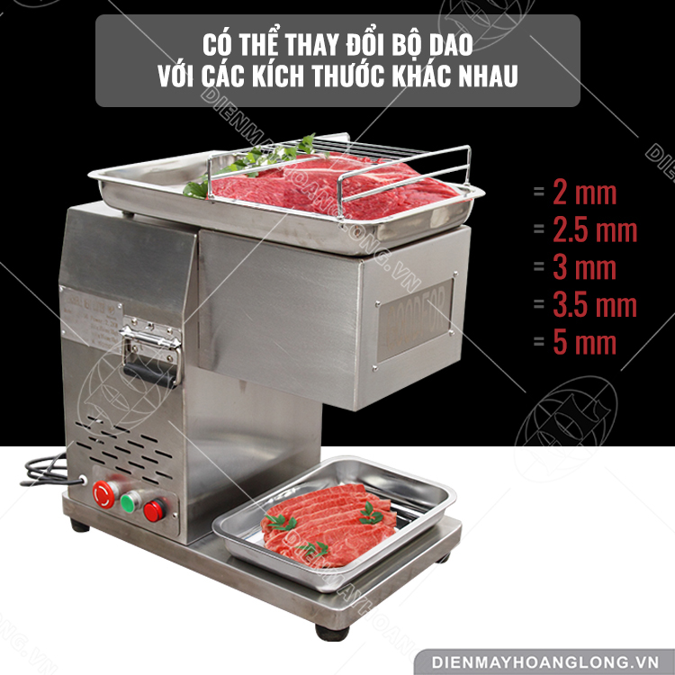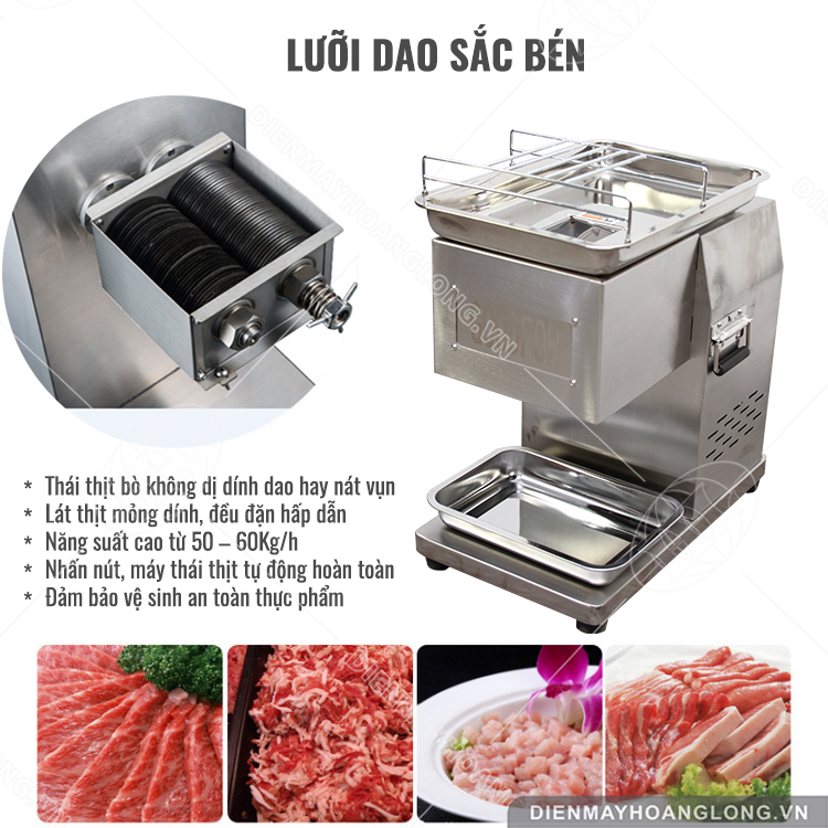 - Lưỡi dao được cấu tạo có các vết khía giúp cho máy bám thịt tốt hơn, nó tự động kéo thịt xuống máy để thái thịt.